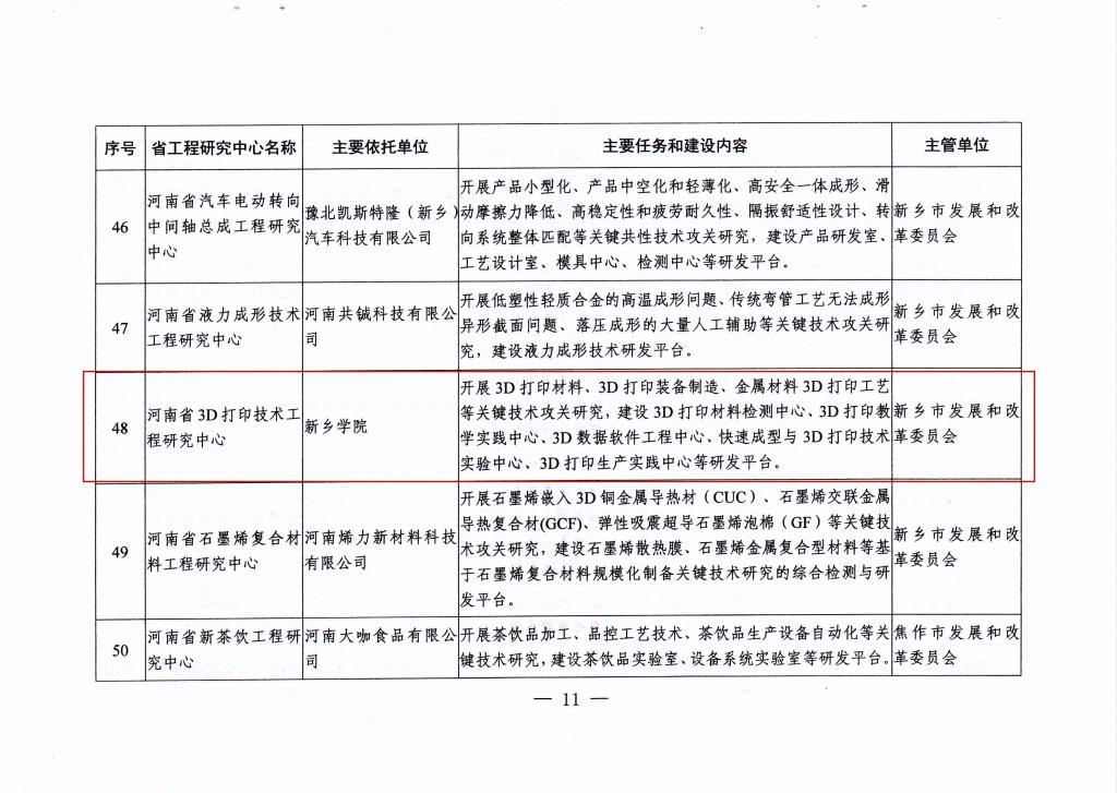 研究中心由公司与新乡市红旗区人民政府、西北工业大学共同建设。围绕我省3D打印产业需求,针对3D打印新材料、智能装备、先进制造等关键技术开展研究,加快科研成果向现实生产力的转化,实现相关技术领域的人才、项目和基地的有机结合。研究中心的获批,是对公司近年来在3D打印学科专业建设和科学研究等工作的充分肯定,也是公司在应用型本科和新工科建设等方面取得的又一丰硕成果。