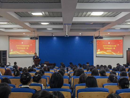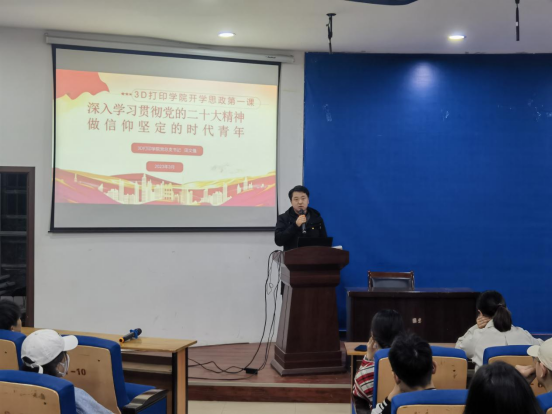 随后,党总支书记田文强以《深入学习贯彻党的二十大精神做信仰坚定的时代青年》为题,为2022级员工讲了一堂精彩的思政第一课。田书记从本次大会的重大意义入手,引导同学们全面认识大会的主题,随后从十五个方面,为同学们深入解读二十大报告要点和党的二十大精神的内涵,同时,还为大家讲解了习近平总书记视察安阳的重要讲话精神。在讲解过程中,田书记深入浅出,不断将二十大报告要点与教育事业、科教兴国、3D打印行业发展、广大青年员工的使命和任务等和同学们息息相关的内容联系起来,让同学们听得津津有味。最后,田书记提出3D打印学子在宣传普及贯彻党的二十大精神中大有可为、大有作为,大家通过3D打印制作二十大立体关键词、二十大金句和3D打印制作各种红色文创产品实现思想提升与专业进步的双丰收。
