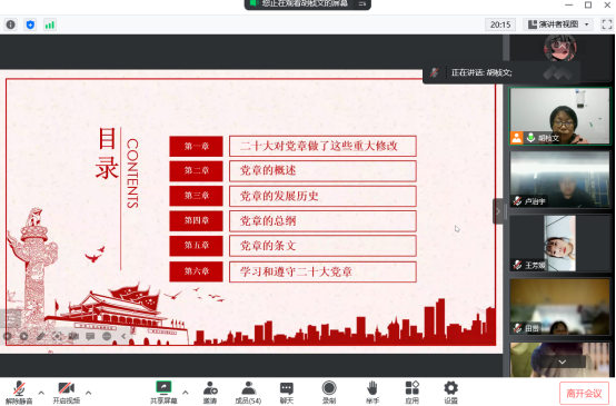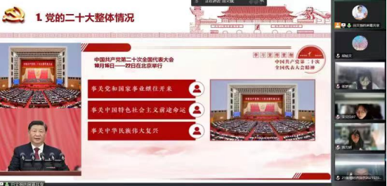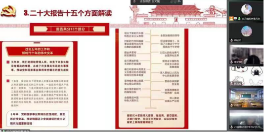 在党的二十大精神引领下,公司采用线上方式为师生入党积极分子培训班作专题培训。田文强在培训班上宣讲党的二十大精神,题目是《学习贯彻党的二十大精神,做信仰坚定的青年老员工党员》。公司教师党支部组织委员胡桢文结合党的二十大审议通过的《中国共产党章程(修订案)》的决议,为党的新生力量重新解读中国共产党章程。