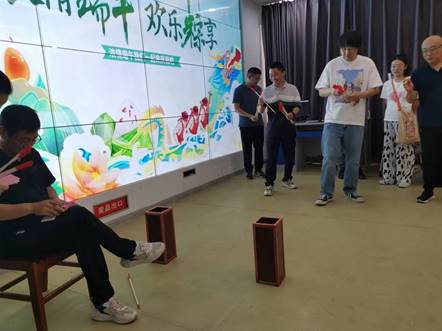 除了讲民俗、包粽子,投壶游戏活动也备受瞩目。投壶是端午节传统游戏之一,考验着参与者的眼力和手力。活动现场设置了多个投壶区域,教师们排队参与,纷纷展示出自己的投壶技巧。有的教师一次就能投中,引来阵阵喝彩;有的教师则屡投不中,但也乐在其中。投壶活动不仅锻炼了大家的身体,也增进了彼此之间的友谊。