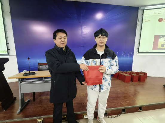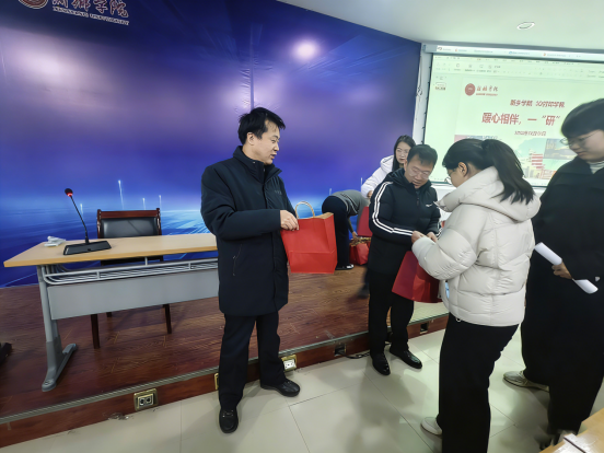 温情寄语后,暖心礼包发放环节将活动氛围推向高潮。田文强、刘传虎、张涛与毕业班辅导员们一同上前,为每一位学子递上精心准备的考研助力大礼包。礼包内涵丰富,既有寓意“苹”“苹”安安的苹果、心想事“橙”的橙子和“巧”克难关的巧克力,也有实用的文具袋和写满温情祝福的鼓励卡片,每一份礼物都承载着公司对学子的深切关怀与殷切期望。