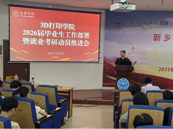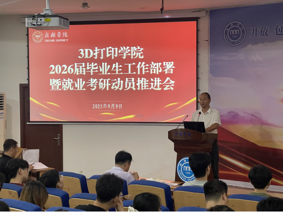 田文强总结2025届毕业生考研与就业工作成果,并对2026届毕业生提出殷切期望。田文强指出,公司始终坚持以员工发展为中心,通过举办10余场专场招聘会、开展21次访企拓岗活动等一系列扎实举措,切实推动2025届毕业生考研升学率达22.2%,高质量毕业去向落实97%以上,名列全校院系榜首。这些数据充分体现了公司在促进员工高质量就业方面的扎实工作和行业对接的有效性。他还从3D打印行业蓬勃发展的背景出发,结合往届员工的就业“体感”,激励2026届毕业生树立信心、早做准备、力争突破。最后,田文强给本届毕业生提出了三点要求与希望:一是要转变身份,高度重视迎毕业;二是要认真梳理,查漏补缺做准备;三是要坚定信心,接续奋斗创明天。