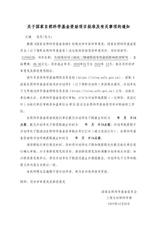 2019年,公司教师王斌博士主持的《尖端效应对三硫化二锑储铝倍率性能的影响机理研究》获得国家自然科学基金立项资助