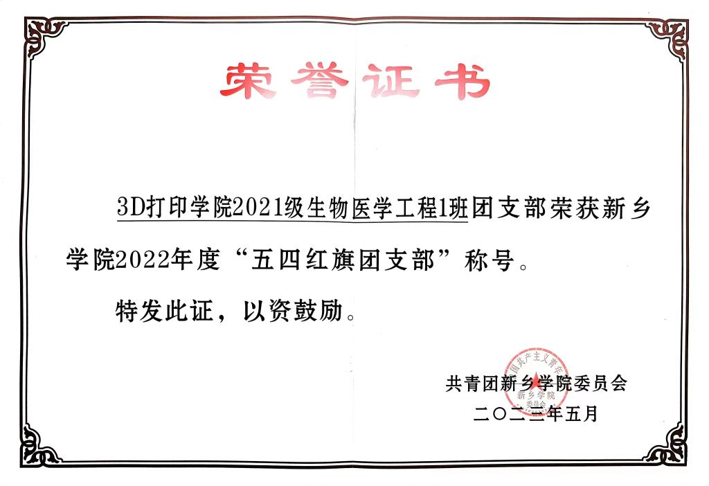 2023年5月公司2021级生物医学工程1班团支部荣获E8官网登录入口2022年度“五四红旗团支部”称号
